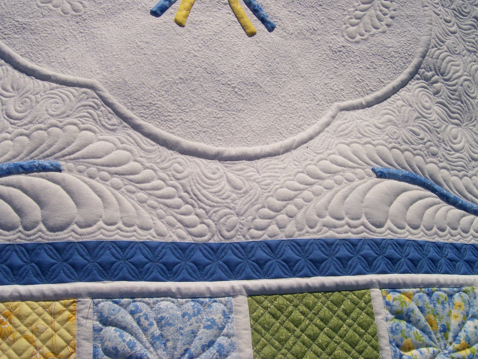 Just thought I'd share how to get more control when quilting on a frame. When doing small detail work your machine seems to want to fly all over the place. Especially if you have a light weight like mine. After doing hours of research I found that you can make rice bags...like I want to sew a bag. NOPE! The directions called for (2) 2 lb bags. So I decided I would cheat and just roll up some yardage and it worked! The other thing that you need to do in order to get more control is to lower your quilt till it lays directly on the bed of your machine. You don't want to much drag or distortion of your backing. Then lay your weight of choice up against you take up bar. This works like a charm! Micro handles also help a great deal. You can get several different machine micro handles here. Mine have be modified by me. I know it doesn't look pretty but it functional. I've also taken the front cover off of my machine for better visibility.