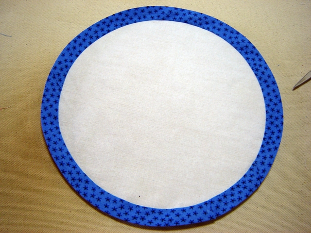 This is when that contrasting thread come in handy. Put a few tiny drops of glue on the edge of your circle. I line up my seam with the edge of the circle, working in about 2" sections, use an iron to set the glue and move on to the next section until you make it all the way around the circle.